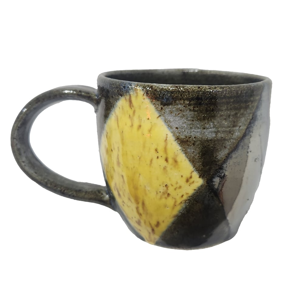Glazed ceramic mug in colorful argyle pattern. 3.5" tall, 3.5" wide. Made in 2025.